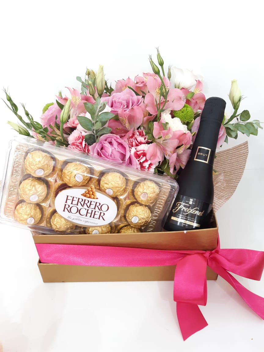 CAIXA PRESENTE COM LINDO ARRANJO FERRERO ROCHER E CHAMPAGNE FLEXNET BRUT.