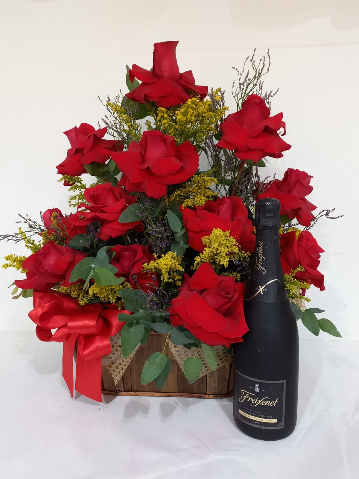 ARRANJO COM 12 ROSAS COLOMBIANAS COM CHAMPAGNE 750ML FREIXENET