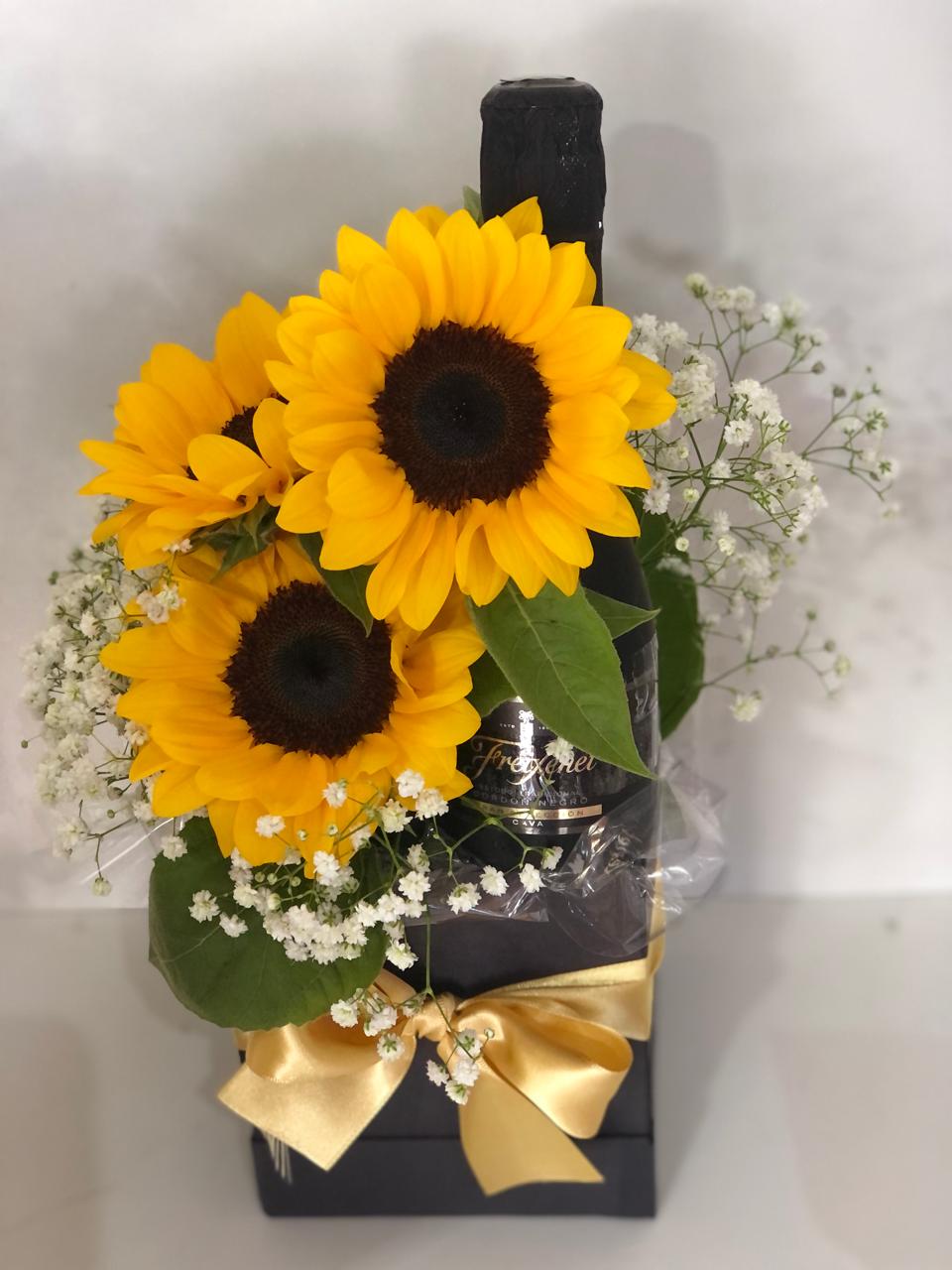 ARRANJO GIRASSOIS COM CAIXA COM CHAMPAGNE