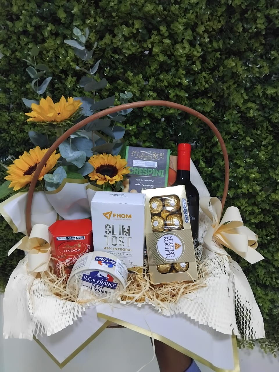 CESTA VIME COM GIRASSOIS, VINHO, QUEIJO, 2 TIPO CAIXA BISCOITOS IMPORTADOS 1 CAIXA LINDT CHOCOLATES