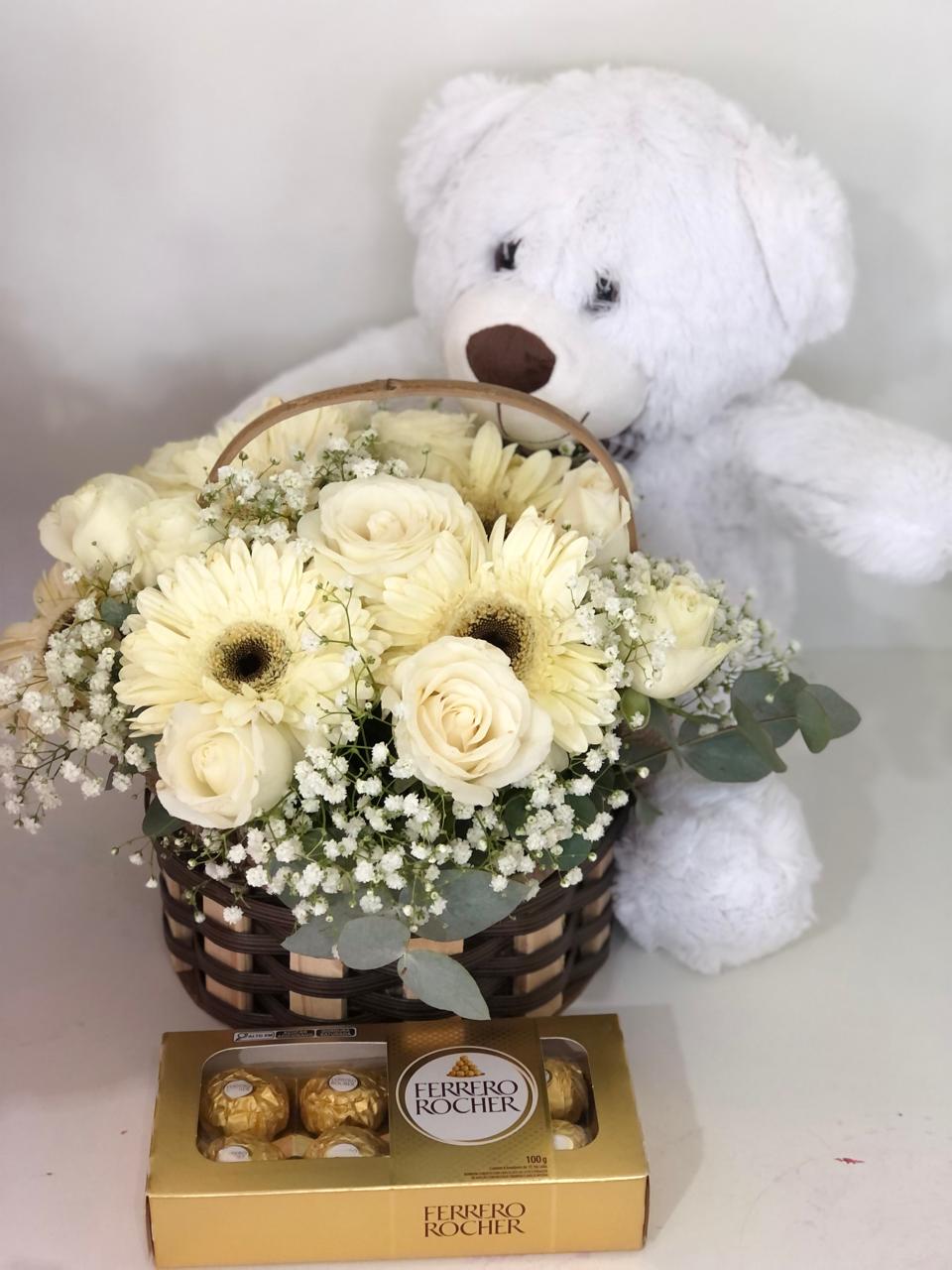 cesta com flores rosas e gerberas urso medio e ferrero rocher
