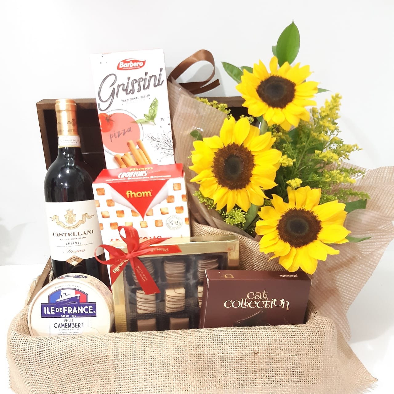 ARRANJO DE GIRASSOIS CAIXA BAÚ DE MADEIRA COM VINHO 2 TIPO DE BISCOITO E QUEIJO CHOCOLATE 2CAIXA PLANALTO DE GRAMADO