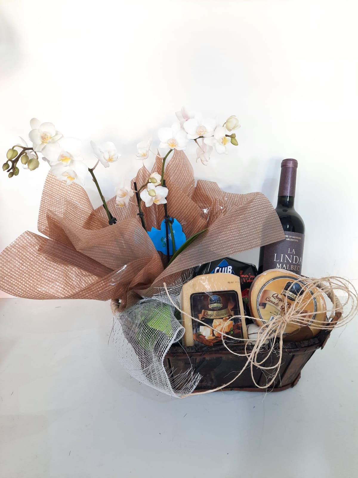 lindo bau de madeira com orquidea e 3 tipos de queijo vinho la linda